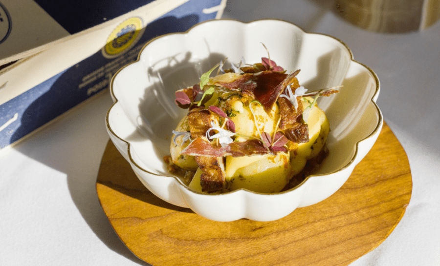Dresser les Bonnottes en volume dans l'assiette, napper généreusement de sauce Curé Nantais, saupoudrer d'assaisonnement maison. Disposer les chips de jambon de Vendée et les lardons de lard nantais grillé. Parsemer de ciboulette ciselée avant de servir.