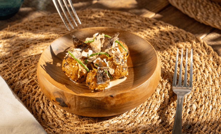 Incorporer le beurre algues & salicornes aux Bonnottes encore chaudes et bien égouttées. Mélanger délicatement pour bien les enrober.