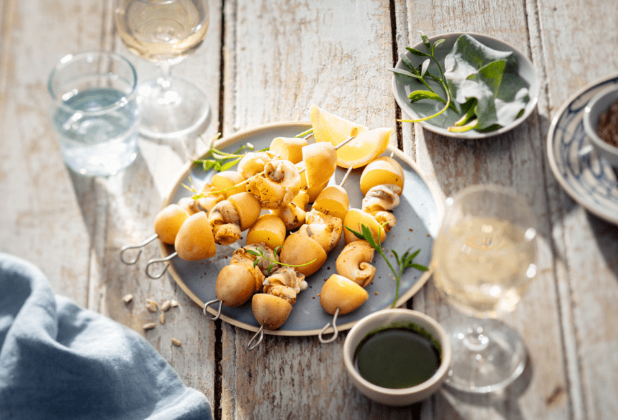 Décortiquer les bulots, les enfiler sur des brochettes en alternant avec les primeurs dorées. Dresser sur un plat, assaisonner et servir aussitôt avec le pesto des marais.