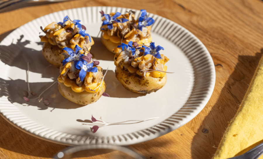 Laquer chaque pomme de terre avec le glaçage réduit. Garnir généreusement de tartare de coques, déposer un filet de gel de jaune d'œuf en zigzag sur le dessus. Planter les coques en coquille, langues vers le haut, toutes orientées dans le même sens. Décorer de fleurs comestibles ou de feuilles de persil frites.