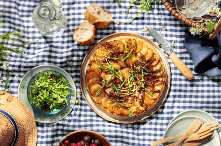 Préchauffer le four à 200°C. Couper les primeurs en tranches épaisses. Dans un moule à manqué, répartir les oignons, puis disposer les tranches en rosace. Saler et poivrer.